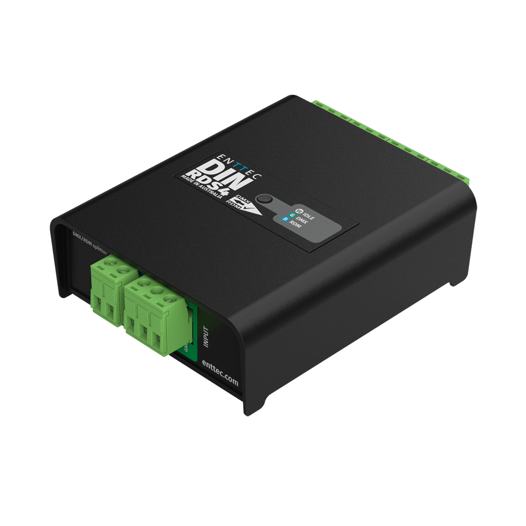 Housed in a slim, electrically-insulated, 4-DIN-module enclosure, the DIN RDS4 is compatible with DMX512-A & RDM (E1.20). The DIN RDS4 actively changes its refresh rate to match your DMX input source.